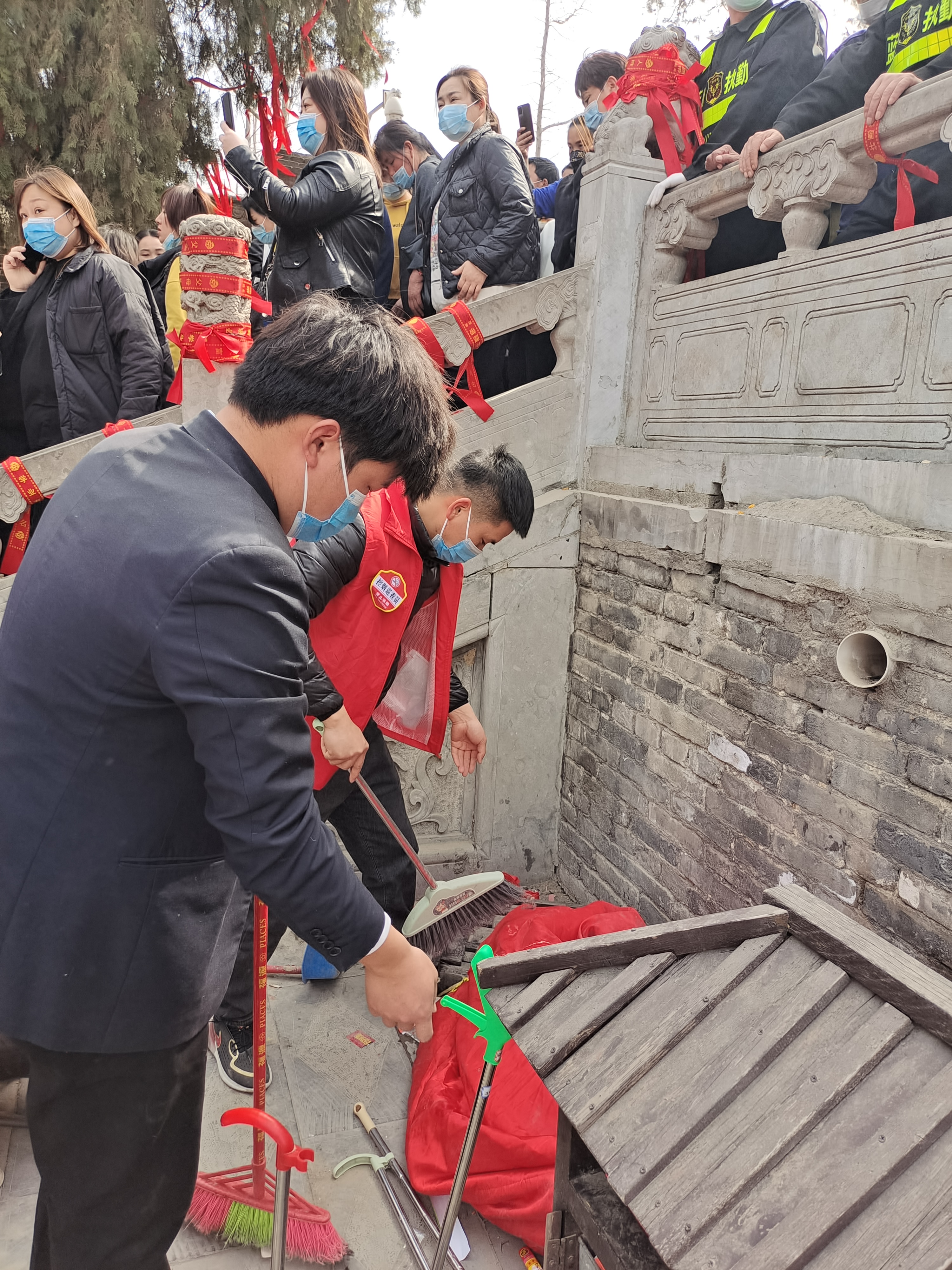 在伏羲陵墓后的蓍草園周圍,有人買紅布條系在欄桿上祈福,有人虔心祝禱。當(dāng)蓍草成為聚焦點時,有人卻拿著打掃工具默默清理垃圾,讓蓍草園成為一方“凈土”。見他們身穿紅馬甲,記者上前詢問,原來是來自建業(yè)物業(yè)的志愿者,其中一名叫李小宇,他說太昊陵已經(jīng)成為淮陽門面,要做好衛(wèi)生,把太昊陵的良好形象維持住?!拔覀兌际亲栽盖皝恚尲亦l(xiāng)父老不論啥時候都看到一個干干凈凈的太昊陵!”李小宇說。