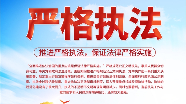• “全面依法治國(guó)的重點(diǎn)應(yīng)該是保證法律嚴(yán)格實(shí)施?!眹?yán)格規(guī)范公正文明執(zhí)法,事關(guān)人民群眾切身利益,事關(guān)黨和政府法治形象。