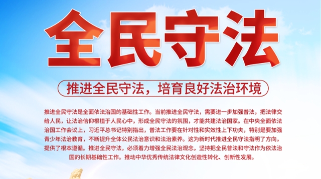 • 推進(jìn)全民守法是全面依法治國(guó)的基礎(chǔ)性工作。當(dāng)前推進(jìn)全民守法,需要進(jìn)一步加強(qiáng)普法,把法律交給人民,讓法治信仰根植于人民心中,形成全民守法的氛圍,才能共建法治國(guó)家。