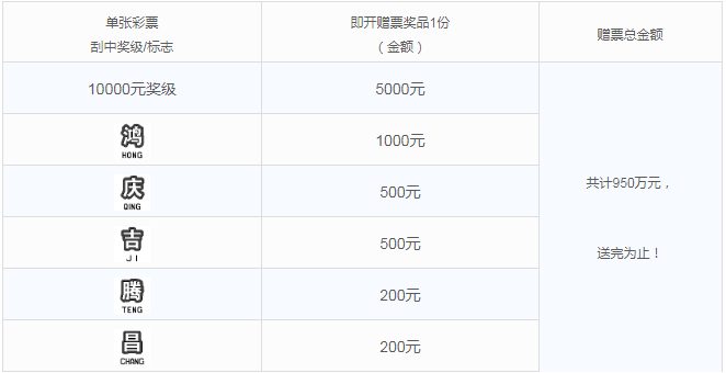 活動期間,購彩者在我省任一體彩銷售實體店購買指定活動票種,若單張彩票刮中符合獎勵條件的獎級或標志,經(jīng)實體店終端兌獎設備成功完成獎金兌付(如中獎)及促銷兌獎掃描后,即可獲得即開票贈票獎品一份。總額有限,送完為止,詳見下表: