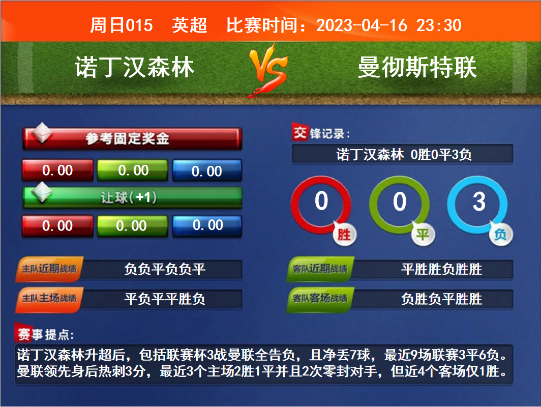 比賽時(shí)間:2023-04-16 23:30賽事提點(diǎn):諾丁漢森林升超后,包括聯(lián)賽杯3戰(zhàn)曼聯(lián)全告負(fù),且凈丟7球,最近9場(chǎng)聯(lián)賽3平6負(fù)。曼聯(lián)領(lǐng)先身后熱刺3分,最近3個(gè)主場(chǎng)2勝1平并且2次零封對(duì)手,但近4個(gè)客場(chǎng)僅1勝。
