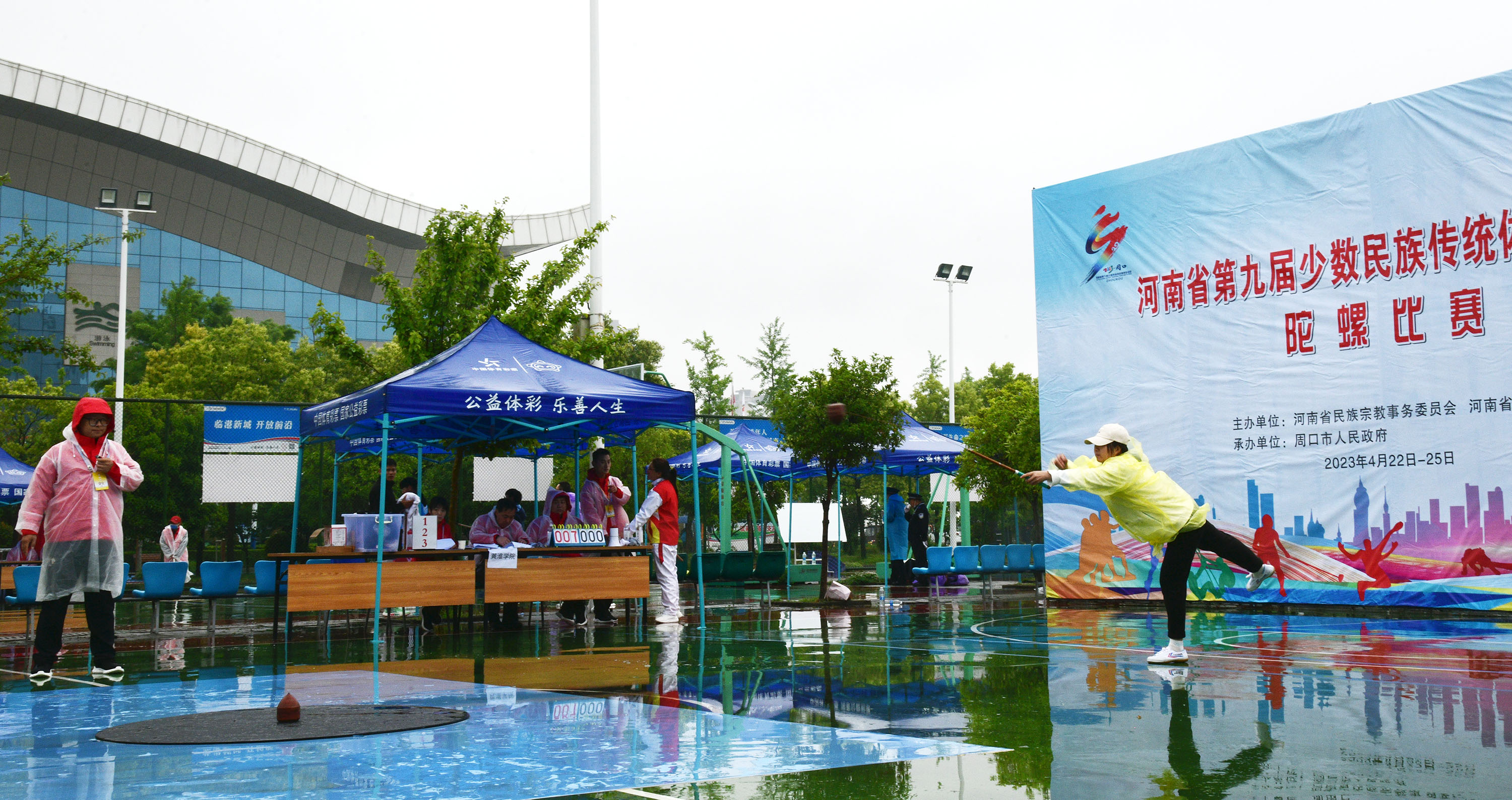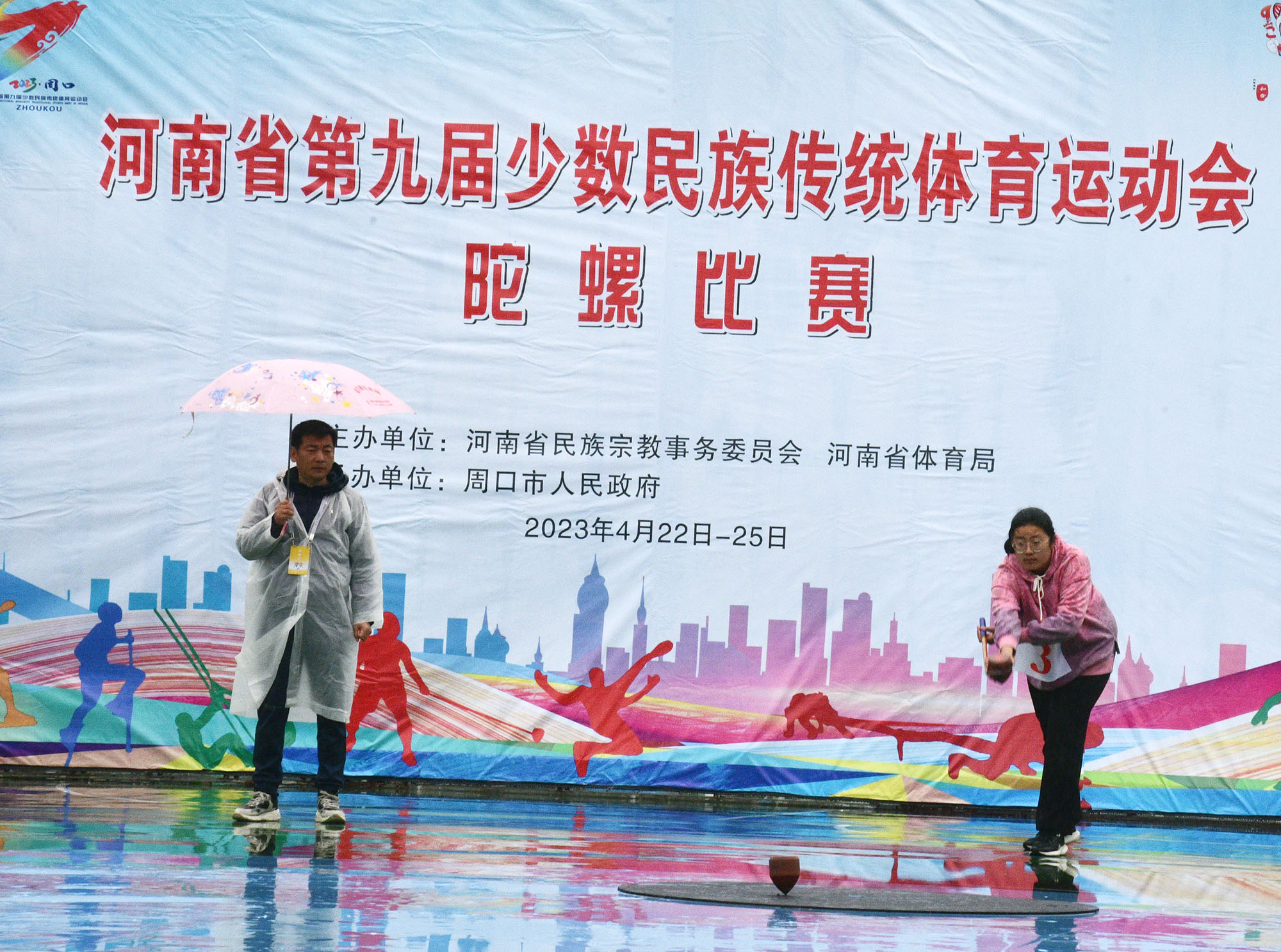 4月23日上午,河南省第九屆少數(shù)民族傳統(tǒng)體育運(yùn)動會開賽。圖為在市體育中心進(jìn)行的板鞋競速和陀螺比賽。記者 梁照曾 攝