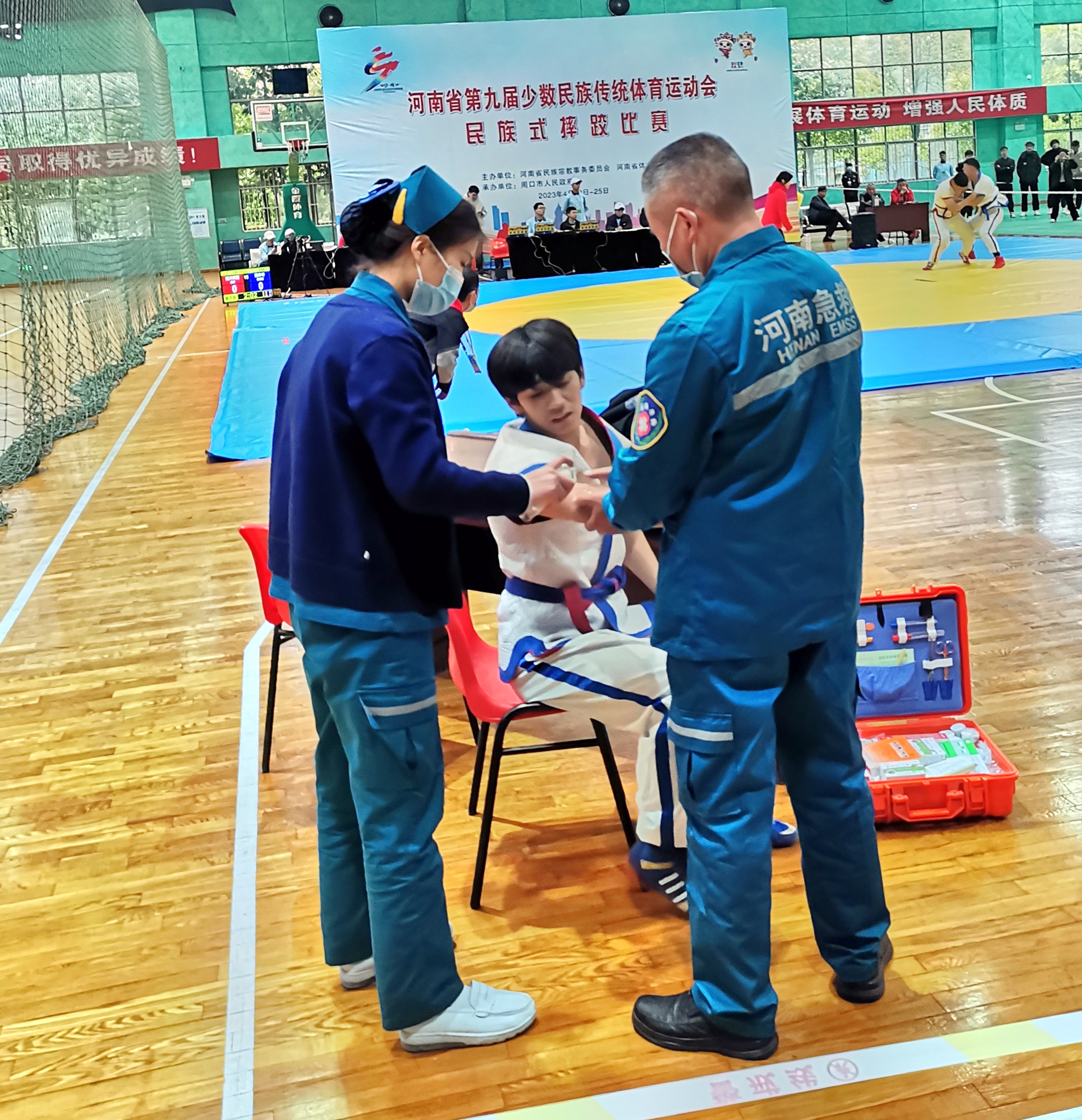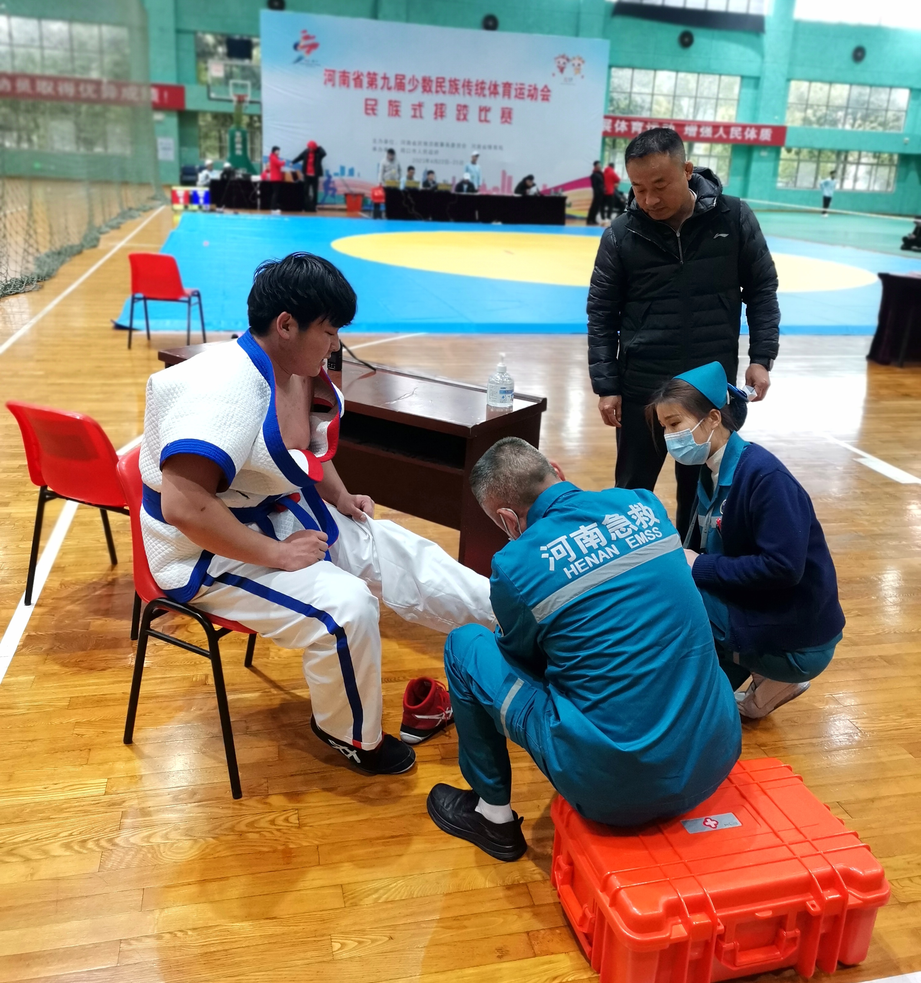 4月22日至26日,河南省第九屆少數(shù)民族傳統(tǒng)體育運(yùn)動(dòng)會(huì)在周口市舉辦。為確保來(lái)賓、運(yùn)動(dòng)員、教練員、技術(shù)官員等參會(huì)人員的醫(yī)療衛(wèi)生安全,周口市衛(wèi)生健康部門(mén)全面調(diào)動(dòng)全市醫(yī)療資源,建立覆蓋各競(jìng)賽項(xiàng)目及指定接待賓館的醫(yī)療救治、衛(wèi)生監(jiān)督、防疫消殺等醫(yī)療保健服務(wù)體系,認(rèn)真完善各項(xiàng)工作方案、預(yù)案,制定細(xì)化工作流程,為省運(yùn)動(dòng)會(huì)提供及時(shí)有效、熱情周到的醫(yī)療衛(wèi)生保障服務(wù)。圖為運(yùn)動(dòng)員在比賽中受傷,現(xiàn)場(chǎng)保障的醫(yī)護(hù)人員迅速處置。