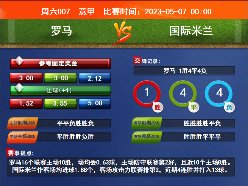 比賽時(shí)間:2023-05-07 00:00賽事提點(diǎn):羅馬16個(gè)聯(lián)賽主場(chǎng)10勝,場(chǎng)均丟0.63球,主場(chǎng)防守聯(lián)賽第2好,且近10個(gè)主場(chǎng)8勝。國(guó)際米蘭作客場(chǎng)均進(jìn)球1.88個(gè),客場(chǎng)攻擊力聯(lián)賽排第2,近期4連勝并打入13球。