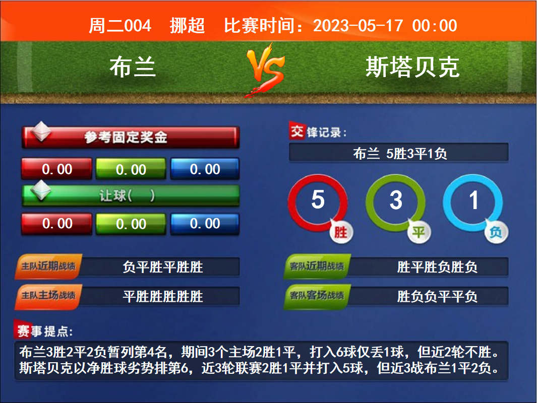比賽時(shí)間:2023-05-17 00:00賽事提點(diǎn):布蘭3勝2平2負(fù)暫列第4名,期間3個(gè)主場(chǎng)2勝1平,打入6球僅丟1球,但近2輪不勝。斯塔貝克以?xún)魟偾蛄觿?shì)排第6,近3輪聯(lián)賽2勝1平并打入5球,但近3戰(zhàn)布蘭1平2負(fù)。