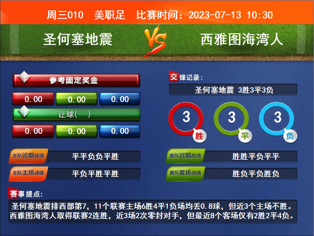 比賽時(shí)間:2023-07-13 10:30賽事提點(diǎn):圣何塞地震排西部第7,11個(gè)聯(lián)賽主場(chǎng)6勝4平1負(fù)場(chǎng)均丟0.8球,但近3個(gè)主場(chǎng)不勝。西雅圖海灣人取得聯(lián)賽2連勝,近3場(chǎng)2次零封對(duì)手,但最近8個(gè)客場(chǎng)僅有2勝2平4負(fù)。
