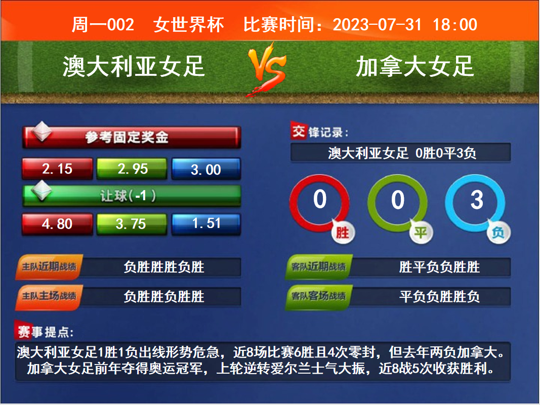 比賽時間:2023-07-31 18:00賽事提點:澳大利亞女足1勝1負出線形勢危急,近8場比賽6勝且4次零封,但去年兩負加拿大。加拿大女足前年奪得奧運冠軍,上輪逆轉(zhuǎn)愛爾蘭士氣大振,近8戰(zhàn)5次收獲勝利。