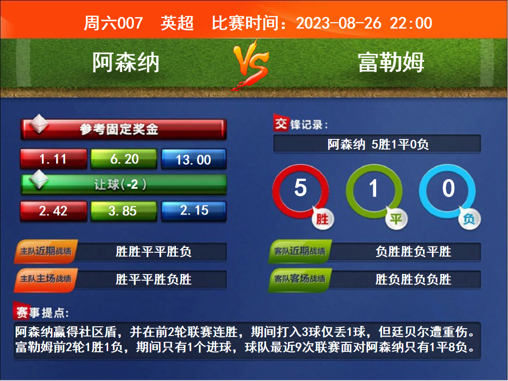比賽時(shí)間:2023-08-26 22:00賽事提點(diǎn):阿森納贏得社區(qū)盾,并在前2輪聯(lián)賽連勝,期間打入3球僅丟1球,但廷貝爾遭重傷。富勒姆前2輪1勝1負(fù),期間只有1個(gè)進(jìn)球,球隊(duì)最近9次聯(lián)賽面對阿森納只有1平8負(fù)。