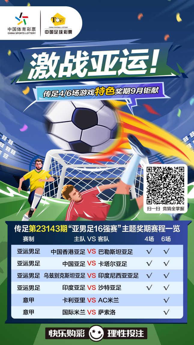 杭州亞運會男足16強出爐,傳足4/6場游戲第23143期競猜對象為4場亞運男足1/8決賽賽事和2場意甲賽事,分別為中國香港亞足VS巴勒斯坦亞足、中國亞足VS卡塔爾亞足、烏茲別克斯坦亞足VS印度尼西亞亞足、印度亞足VS沙特亞足、卡利亞里VSAC米蘭和國際米蘭VS薩索洛。