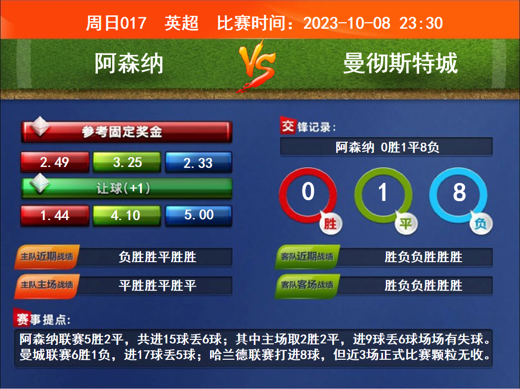 比賽時間:2023-10-08 23:30賽事提點:阿森納聯(lián)賽5勝2平,共進15球丟6球;其中主場取2勝2平,進9球丟6球場場有失球。曼城聯(lián)賽6勝1負(fù),進17球丟5球;哈蘭德聯(lián)賽打進8球,但近3場正式比賽顆粒無收。