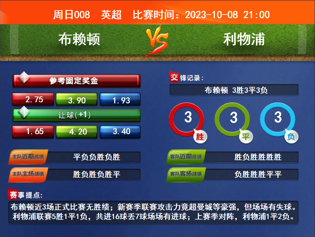 比賽時間:2023-10-08 21:00賽事提點:布賴頓近3場正式比賽無勝績;新賽季聯(lián)賽攻擊力竟超曼城等豪強,但場場有失球。利物浦聯(lián)賽5勝1平1負(fù),共進16球丟7球場場有進球;上賽季對陣,利物浦1平2負(fù)。