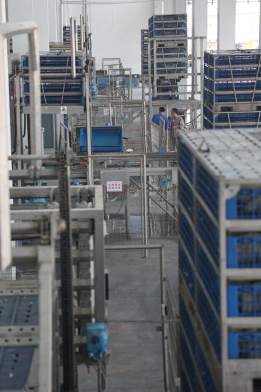 宰雞第一步先消毒,一筐筐自動(dòng)分好的白羽活雞上架后即得到?jīng)_洗,“干干凈凈”地進(jìn)入下一程序——掛雞。步驟與步驟銜接中的自動(dòng)化程度很高,掛雞室光線略暗?!拔覀儾捎脟H化標(biāo)準(zhǔn),宰殺環(huán)節(jié)在暗室進(jìn)行。”相關(guān)人員說。