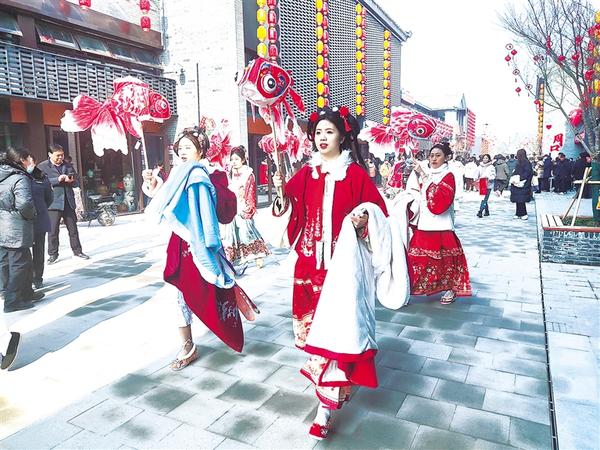 翠袖紅裙、直襟長(zhǎng)袍……身著漢服的演員,手持魚燈,巡游關(guān)帝老街,伴隨著樂曲翩翩起舞,成為一道靚麗的風(fēng)景線。