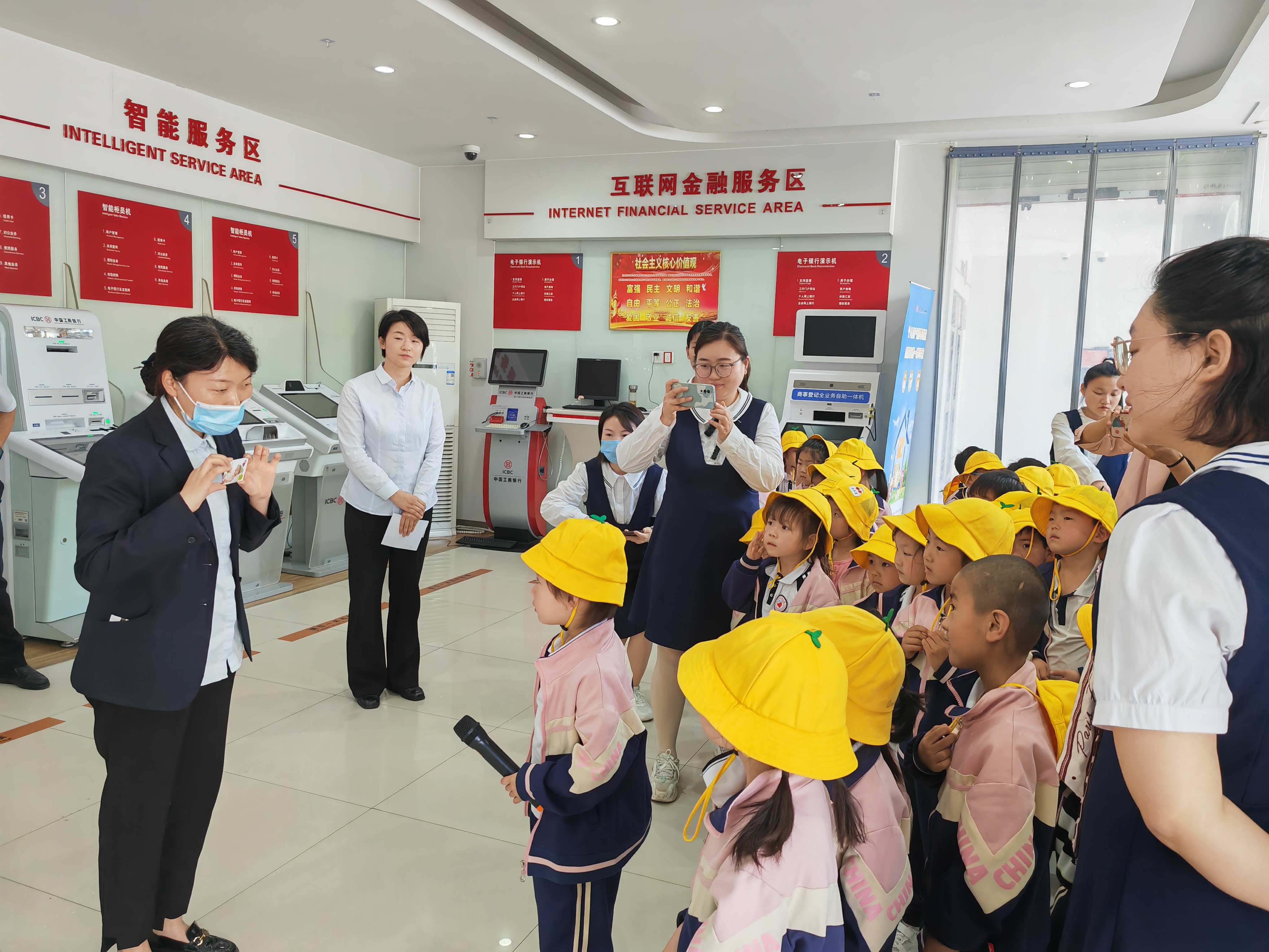 小朋友們在參觀營業(yè)網(wǎng)點中,該行工作人員為孩子們講解取號機、業(yè)務(wù)咨詢臺、服務(wù)窗口、自動存取款機功能,簡要介紹辦理銀行業(yè)務(wù)流程,并對孩子們提出的問題一一解答。