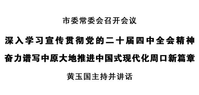 會(huì)議強(qiáng)調(diào),要把學(xué)習(xí)宣傳貫徹黨的二十屆四中全會(huì)精神,作為各級黨委(黨組)理論學(xué)習(xí)中心組集體學(xué)習(xí)的重要內(nèi)容,納入黨校(行政學(xué)院)教育培訓(xùn)的必修課程,做到黨員干部全覆蓋;各級宣傳部門要充分利用各種形式和手段,做好權(quán)威解讀和分眾化傳播,讓廣大黨員干部群眾聽得懂、記得住、落實(shí)在行動(dòng)上;要把貫徹落實(shí)全會(huì)精神與習(xí)近平總書記在河南考察時(shí)重要講話精神緊密結(jié)合起來,聚焦“兩高四著力”,錨定“1+2+4+N”目標(biāo)任務(wù)體系,落實(shí)市委“16232”總體工作思路,突出抓好重點(diǎn)項(xiàng)目建設(shè)和招商引資、農(nóng)業(yè)農(nóng)村、城市規(guī)劃建設(shè)管理、文旅發(fā)展、民生實(shí)事、社會(huì)治理等重點(diǎn)工作,全力以赴打贏“十四五”收官戰(zhàn),高質(zhì)量編制“十五五”規(guī)劃,切實(shí)把全會(huì)部署轉(zhuǎn)化為推動(dòng)現(xiàn)代化周口建設(shè)的實(shí)際行動(dòng)。