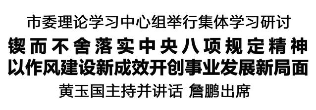 本報(bào)訊(記者 王艷) 1月16日,市委理論學(xué)習(xí)中心組舉行集體學(xué)習(xí)研討,深入學(xué)習(xí)貫徹習(xí)近平新時(shí)代中國特色社會(huì)主義思想,全面貫徹落實(shí)黨的二十屆四中全會(huì)精神,以打攻堅(jiān)戰(zhàn)、持久戰(zhàn)的決心和恒心,鍥而不舍落實(shí)中央八項(xiàng)規(guī)定精神,推進(jìn)作風(fēng)建設(shè)常態(tài)化長(zhǎng)效化,以優(yōu)良作風(fēng)凝心聚力、真抓實(shí)干,為開好民主生活會(huì)打牢思想基礎(chǔ)。市委書記黃玉國主持并講話。市長(zhǎng)詹鵬出席。
