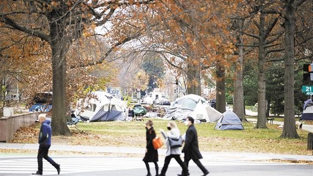 12月8日,在美國華盛頓,行人經過無家可歸者居住的帳篷?!?a href="http://m.fxqnmb.com/content/2021-12/11/content_962080.html" target="_blank" >[詳細]