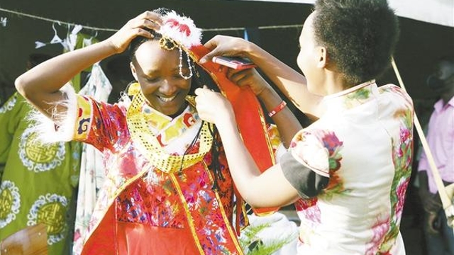 11月10日,學生在盧旺達卡永扎試穿中國服飾?!?a href="http://m.fxqnmb.com/content/2021-11/13/content_959142.html" target="_blank" >[詳細]