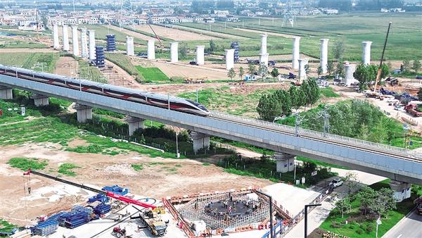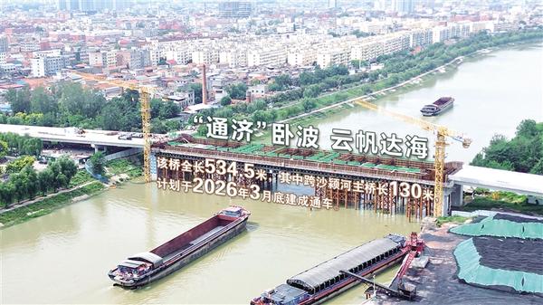 9月16日上午,建設(shè)中的項城通濟(jì)大道橋臥波于沙潁河之上,貨船從30米寬的通航孔緩緩馳過,保障豫貨出海。