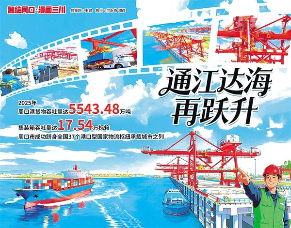 2025 年,周口港交出亮眼答卷:貨物吞吐量 5543.48 萬噸、集裝箱吞吐量 17.54 萬標箱,兩項數(shù)據(jù)雙雙創(chuàng)下歷史紀錄,躋身全國 37 個港口型國家物流樞紐承載城市。