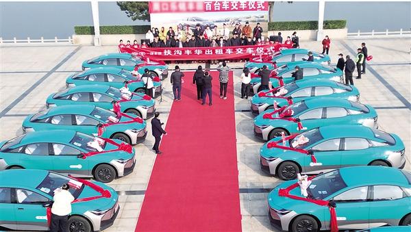 12月19日上午,周口和諧廣場(chǎng)舉行純電動(dòng)出租車交付儀式,一百輛全新純電動(dòng)轎車正式交付扶溝出租車公司并投入運(yùn)營(yíng)。