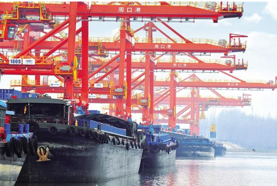 寒冬時節(jié)的沙潁河,一艘艘船舶??吭谥芸谥行母郏呗柊稑蛎β档匮b卸集裝箱,運輸車輛穿梭如織。這里擁有黃金航道,航道水深5米以上,有效行船寬距超過50米,既是河南省乃至淮河流域規(guī)模最大、靠泊能力最強的內(nèi)河港口,也是全國36個內(nèi)河主要港口之一。