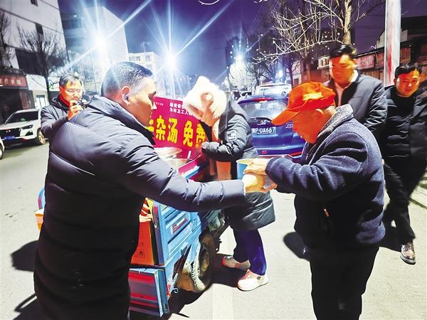 1月8日凌晨5時許,曦愛餐飲集團董事長曹操在淮陽慈善公園為環(huán)衛(wèi)工人送上熱氣騰騰的牛雜湯。