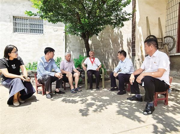 7月1日,沈丘縣付井鎮(zhèn)老黨員楊井明(右三)佩戴“光榮在黨50年”紀念章,為前來看望他的鎮(zhèn)村黨員干部講黨史。據了解,1968年7月1日,楊井明正式成為一名中國共產黨黨員。