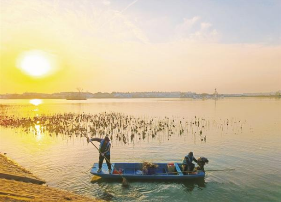 1月12日清晨,淮陽龍湖景區(qū)柳湖岸邊,兩位環(huán)衛(wèi)人乘船打撈湖面漂浮物,確保湖區(qū)環(huán)境干凈衛(wèi)生。