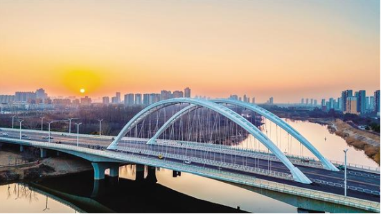 1月14日傍晚,夕陽下的中原路大橋巍峨壯觀,沙潁河水面如鏡。