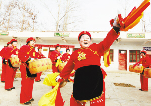 ?、芊鰷峡h江村鎮(zhèn)江南盤鼓隊(duì)正在村室緊張排演節(jié)目。春節(jié)期間,她們走上街頭,為當(dāng)?shù)厝罕娝蜕衔幕蟛汀?nbsp; (記者 王 映 攝)