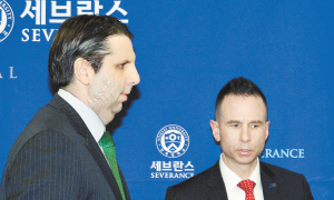 3月10日,在韓國(guó)首爾,美國(guó)駐韓國(guó)大使馬克·利珀特(左)在出院前出席記者會(huì)。當(dāng)?shù)貢r(shí)間5日上午,利珀特在出席首爾世宗文化會(huì)館舉行的活動(dòng)時(shí),被一名韓國(guó)男子用刀劃傷,襲擊嫌疑人被當(dāng)場(chǎng)抓住。