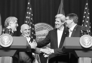 3月23日,在美國戴維營,阿富汗首席執(zhí)行官阿卜杜拉·阿卜杜拉、阿富汗總統(tǒng)阿什拉夫·加尼、美國國務(wù)卿克里和美國國防部長卡特(從左至右)出席新聞發(fā)布會。