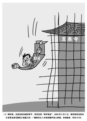 ?、?nbsp;柳濟(jì)南,北美法輪功組織骨干,李洪志的鐵桿粉絲。2008年5月3日,柳濟(jì)南在法輪功大本營龍泉寺建筑工地施工時(shí),一腳踏空從5米高的腳手架上跌落,當(dāng)場(chǎng)斃命,年僅54歲。(漫畫作者 星雨)