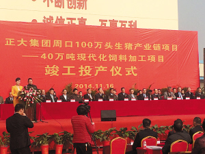 正大集團(tuán)周口100萬(wàn)頭生豬產(chǎn)業(yè)鏈項(xiàng)目竣工投產(chǎn)儀式現(xiàn)場(chǎng)。