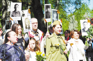 ?、?月9日,在拉脫維亞首都里加,人們手持在衛(wèi)國戰(zhàn)爭中犧牲的親人照片參加紀(jì)念衛(wèi)國戰(zhàn)爭勝利70周年活動。