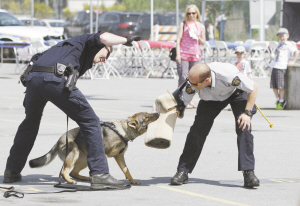 加拿大迎來(lái)全國(guó)警察周      5月9日, 在加拿大溫哥華地區(qū)的素里市,警察在警局開(kāi)放日活動(dòng)上向民眾示范警犬訓(xùn)練情況。為迎接一年一度的全國(guó)警察周,素里市皇家騎警總部當(dāng)日舉辦開(kāi)放日活動(dòng),向民眾展示警方裝備及介紹警隊(duì)日常工作。新華社發(fā)