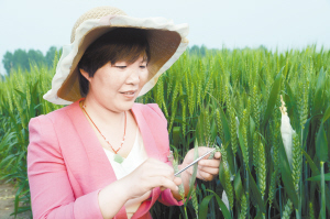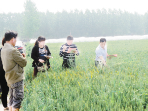 下圖:昨日,項城市農(nóng)科所技術(shù)人員正在進行小麥雜交授粉。連日來,該所抓住小麥授粉期的晴好天氣,組織技術(shù)人員開展雜交授粉實驗,確保小麥單產(chǎn)同步提高。(蔣樹保 攝)