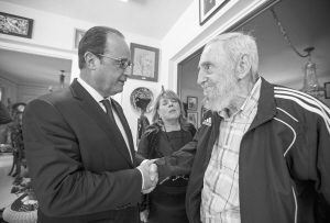 菲德爾·卡斯特羅會見奧朗德   5月11日,在古巴首都哈瓦那,古巴前領(lǐng)導(dǎo)人菲德爾·卡斯特羅(右)會見到訪的法國總統(tǒng)奧朗德(左)。當(dāng)日,法國總統(tǒng)奧朗德在古巴哈瓦那大學(xué)演講。他在演講中呼吁美國解除對古巴的經(jīng)濟(jì)封鎖。奧朗德于10日晚抵達(dá)哈瓦那,開始對古巴進(jìn)行為期3天的訪問,他是冷戰(zhàn)結(jié)束后首位訪問古巴的法國國家元首。