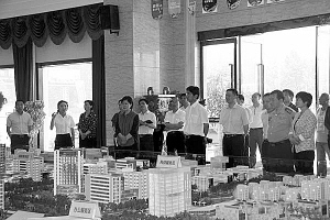 羅文閣在商務(wù)中心區(qū)規(guī)劃沙盤前聽(tīng)取項(xiàng)目進(jìn)展情況匯報(bào)。丁宇濤 攝