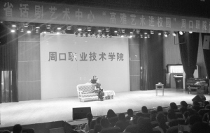 6月9日下午,由河南省教育廳、文化廳、財政廳主辦的2015年“高雅藝術(shù)進(jìn)校園”——省話劇藝術(shù)中心專場演出在周口職業(yè)技術(shù)學(xué)院礪德廳舉行。激情的舞臺對白、絢麗的歌舞場景,話劇藝術(shù)中心的演員們聯(lián)袂為800余名師生獻(xiàn)上了一場視聽盛宴。(孫先鋒 攝)