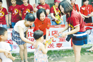 6月19日,端午節(jié)臨近之際,“美膚寶”攜手沈丘縣李玲化妝品店,來到沈丘縣豐產(chǎn)河小學(xué)開展“美膚寶陽光計(jì)劃”公益活動(dòng),共同為200多名留守兒童捐贈(zèng)學(xué)習(xí)用品。圖為工作人員為留守兒童發(fā)放學(xué)習(xí)用品。(記者 韋偉 通訊員 王祥宇 柳珂)