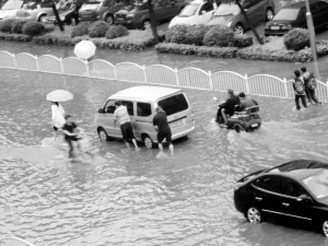 昨日,大雨后的周口市區(qū)七一東路一片汪洋,平常車載人,雨后人推車。