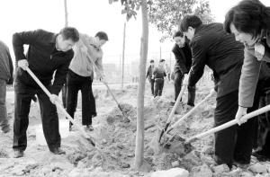 市委書記徐光等領(lǐng)導仔細培土。記者 王映 攝