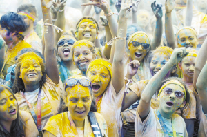 當(dāng)?shù)貢r間6月13日,在美國洛杉磯,約萬名跑步愛好者在洛杉磯道奇球場外參加“彩色跑”活動?!安噬堋笔且豁棅蕵放懿巾椖?,全程為5公里,每公里設(shè)置一個彩色站,當(dāng)參與者跑至彩色站時,由志愿者向參與者拋灑彩色粉末。與傳統(tǒng)跑步競速相比,“彩色跑”活動雖然沒有贏家或獎品,但強(qiáng)調(diào)“參與、娛樂和色彩”的重要性。
